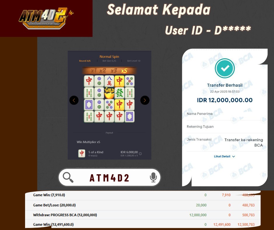 ATM4D2 dikenal sebagai situs terpercaya yang selalu menghadirkan pengalaman bermain slot online yang aman, fair, dan berlisensi resmi. Di sini, kami tidak hanya sekadar memberikan janji, tapi bukti nyata berupa slip kemenangan yang dapat Anda lihat secara langsung.
