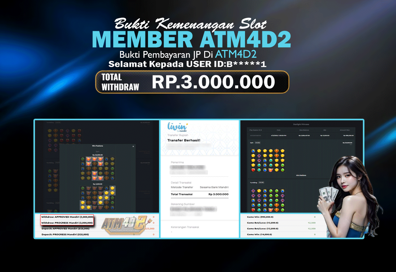 ATM4D2 dikenal sebagai situs terpercaya yang selalu menghadirkan pengalaman bermain slot online yang aman, fair, dan berlisensi resmi. Di sini, kami tidak hanya sekadar memberikan janji, tapi bukti nyata berupa slip kemenangan yang dapat Anda lihat secara langsung.