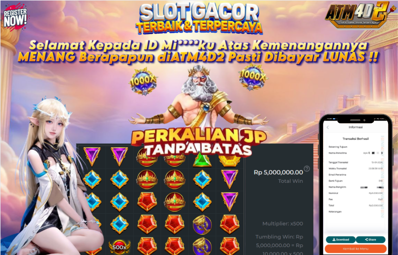 ATM4D2 dikenal sebagai situs terpercaya yang selalu menghadirkan pengalaman bermain slot online yang aman, fair, dan berlisensi resmi. Di sini, kami tidak hanya sekadar memberikan janji, tapi bukti nyata berupa slip kemenangan yang dapat Anda lihat secara langsung.