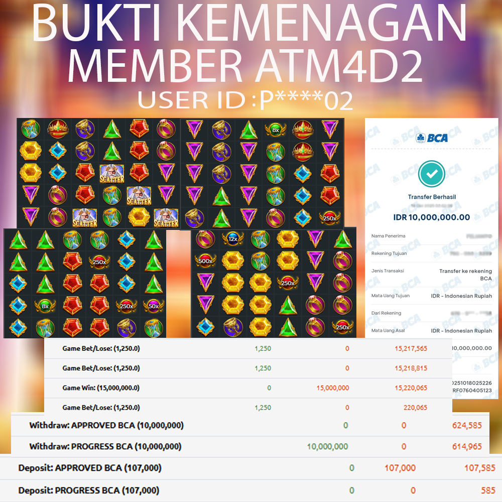 ATM4D2 dikenal sebagai situs terpercaya yang selalu menghadirkan pengalaman bermain slot online yang aman, fair, dan berlisensi resmi. Di sini, kami tidak hanya sekadar memberikan janji, tapi bukti nyata berupa slip kemenangan yang dapat Anda lihat secara langsung.