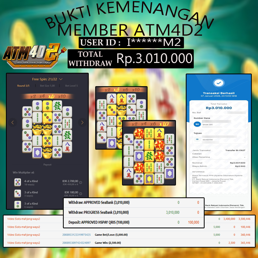 ATM4D2 dikenal sebagai situs terpercaya yang selalu menghadirkan pengalaman bermain slot online yang aman, fair, dan berlisensi resmi. Di sini, kami tidak hanya sekadar memberikan janji, tapi bukti nyata berupa slip kemenangan yang dapat Anda lihat secara langsung.