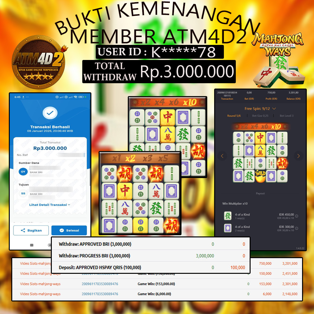 ATM4D2 dikenal sebagai situs terpercaya yang selalu menghadirkan pengalaman bermain slot online yang aman, fair, dan berlisensi resmi. Di sini, kami tidak hanya sekadar memberikan janji, tapi bukti nyata berupa slip kemenangan yang dapat Anda lihat secara langsung.