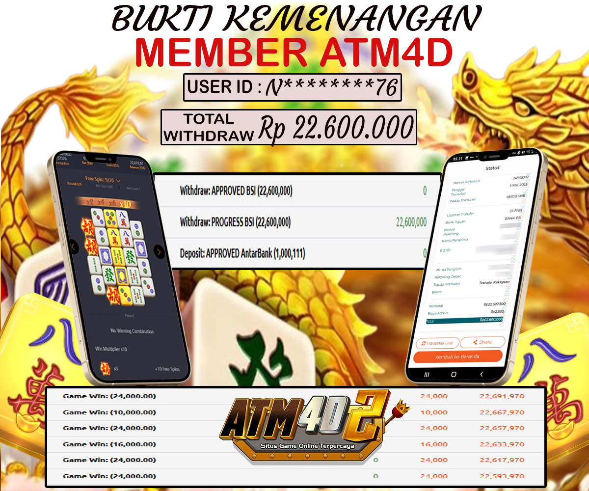ATM4D2 dikenal sebagai situs terpercaya yang selalu menghadirkan pengalaman bermain slot online yang aman, fair, dan berlisensi resmi. Di sini, kami tidak hanya sekadar memberikan janji, tapi bukti nyata berupa slip kemenangan yang dapat Anda lihat secara langsung.