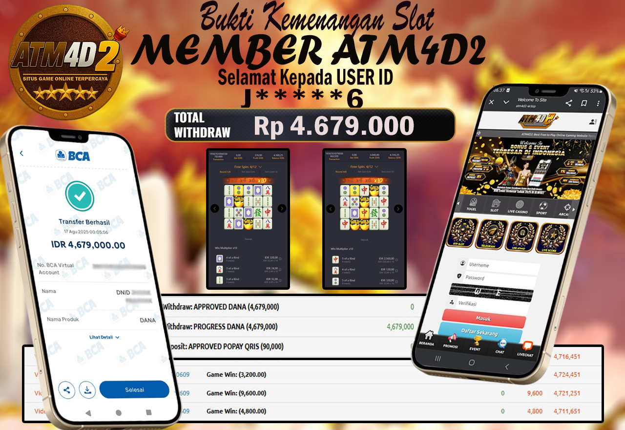 ATM4D2 dikenal sebagai situs terpercaya yang selalu menghadirkan pengalaman bermain slot online yang aman, fair, dan berlisensi resmi. Di sini, kami tidak hanya sekadar memberikan janji, tapi bukti nyata berupa slip kemenangan yang dapat Anda lihat secara langsung.