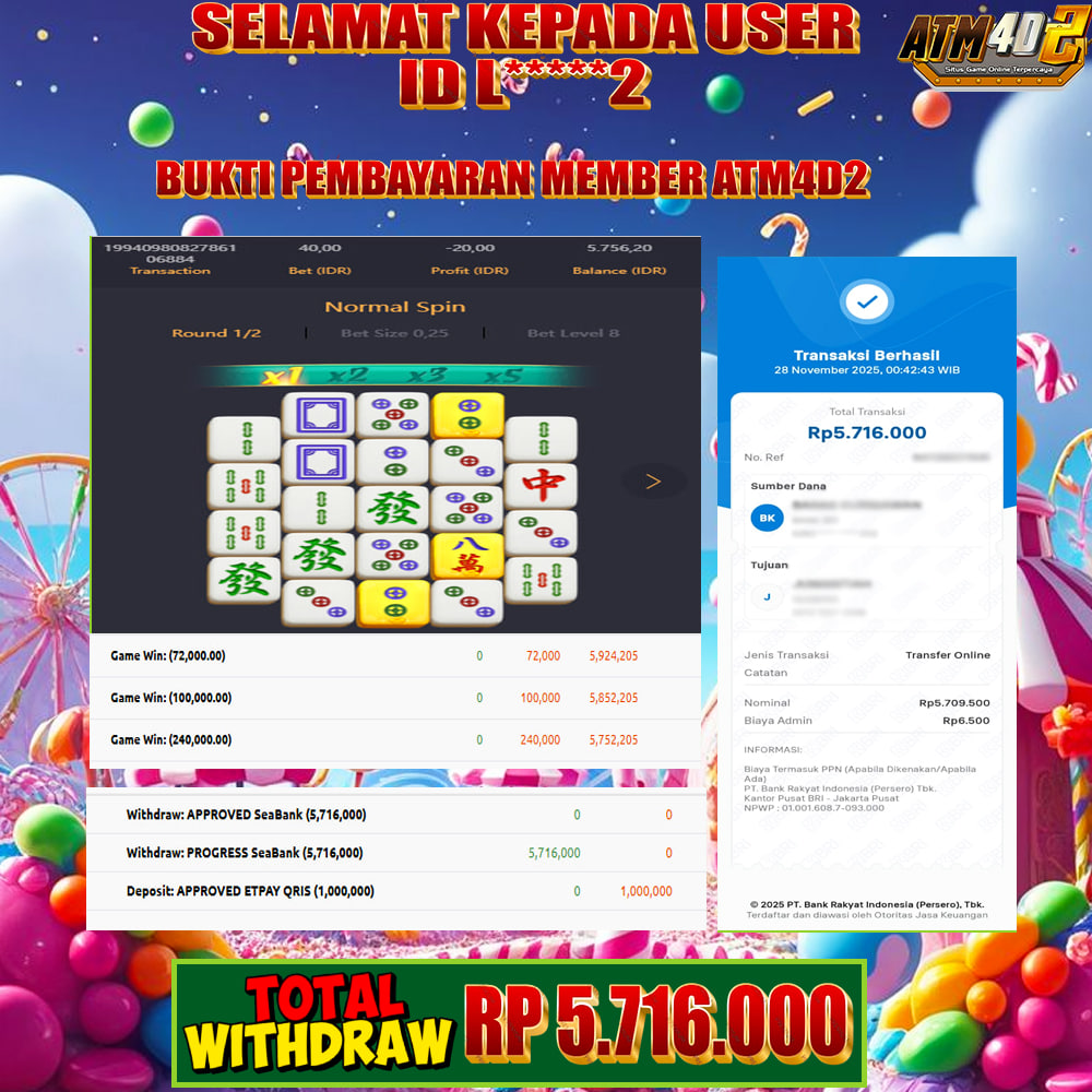ATM4D2 dikenal sebagai situs terpercaya yang selalu menghadirkan pengalaman bermain slot online yang aman, fair, dan berlisensi resmi. Di sini, kami tidak hanya sekadar memberikan janji, tapi bukti nyata berupa slip kemenangan yang dapat Anda lihat secara langsung.
