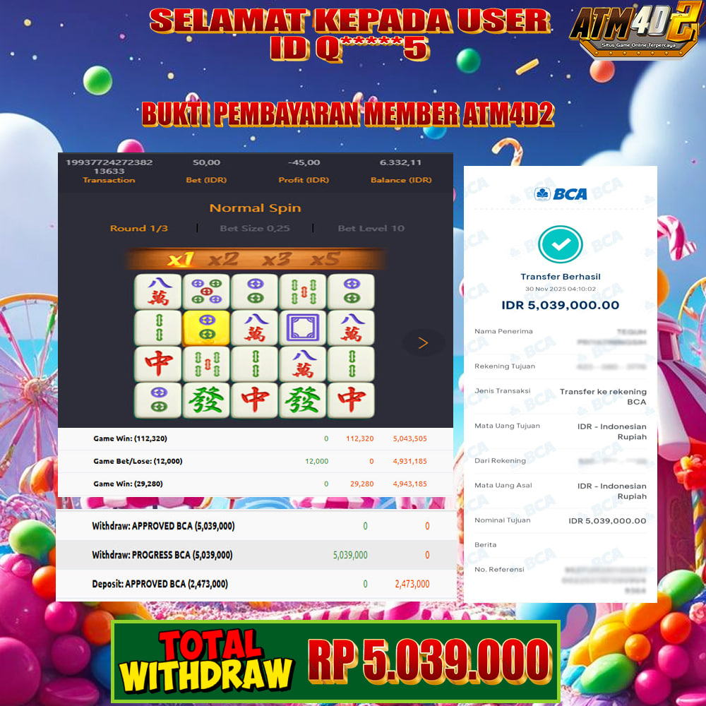 ATM4D2 dikenal sebagai situs terpercaya yang selalu menghadirkan pengalaman bermain slot online yang aman, fair, dan berlisensi resmi. Di sini, kami tidak hanya sekadar memberikan janji, tapi bukti nyata berupa slip kemenangan yang dapat Anda lihat secara langsung.