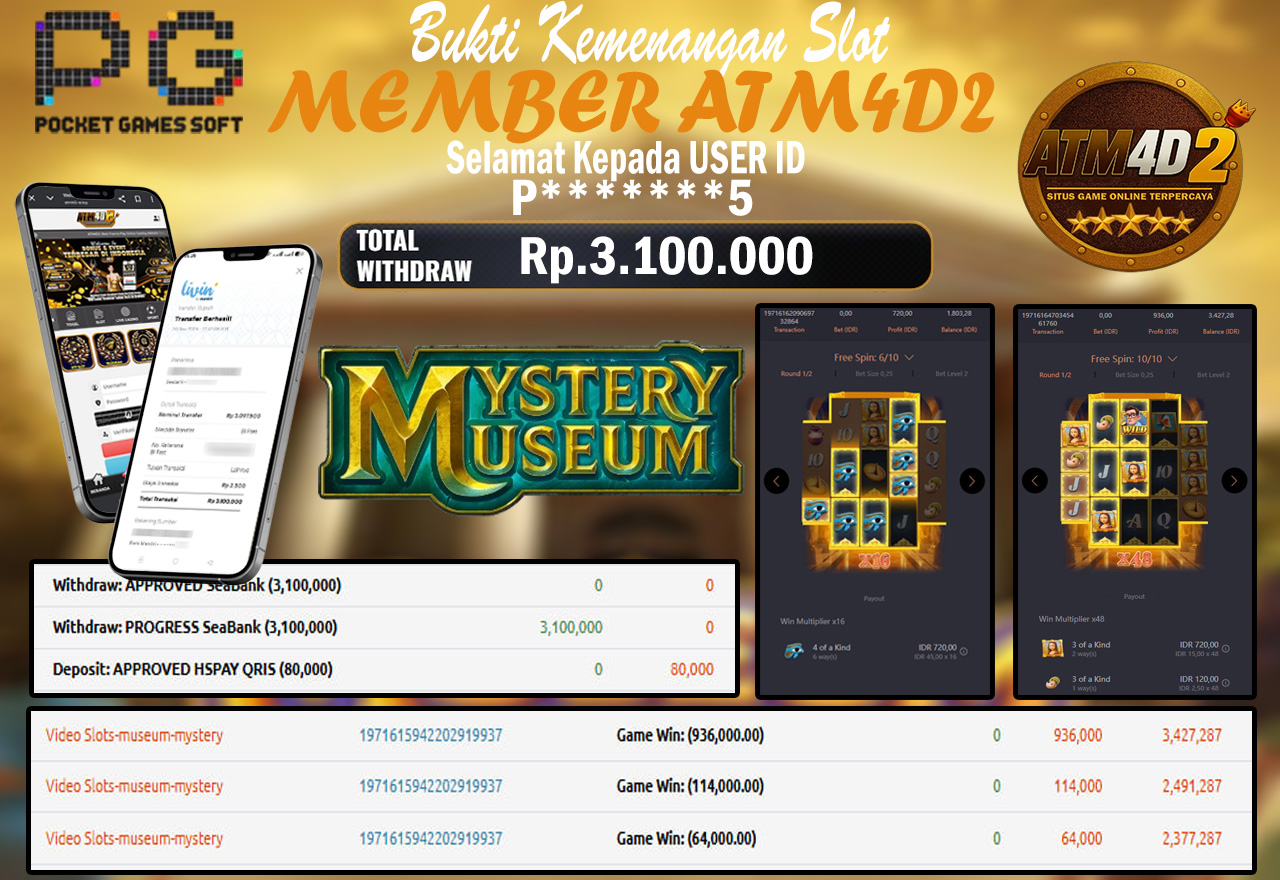 Setiap hari, member ATM4D2 berhasil meraih jackpot besar dari berbagai provider slot ternama yang kami sediakan, seperti Pragmatic Play, Habanero, PG Soft, dan masih banyak lagi. Kami secara rutin menampilkan bukti screenshot atau rekapan kemenangan yang berhasil diraih, mulai dari kemenangan ratusan ribu hingga puluhan juta rupiah. Semua slip kemenangan ini kami hadirkan untuk membuktikan bahwa di ATM4D2, peluang menang itu nyata.