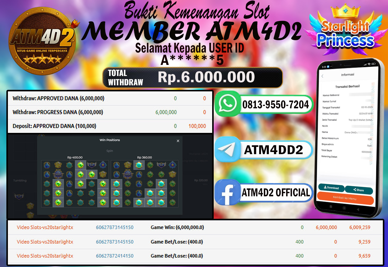ATM4D2 dikenal sebagai situs terpercaya yang selalu menghadirkan pengalaman bermain slot online yang aman, fair, dan berlisensi resmi. Di sini, kami tidak hanya sekadar memberikan janji, tapi bukti nyata berupa slip kemenangan yang dapat Anda lihat secara langsung.