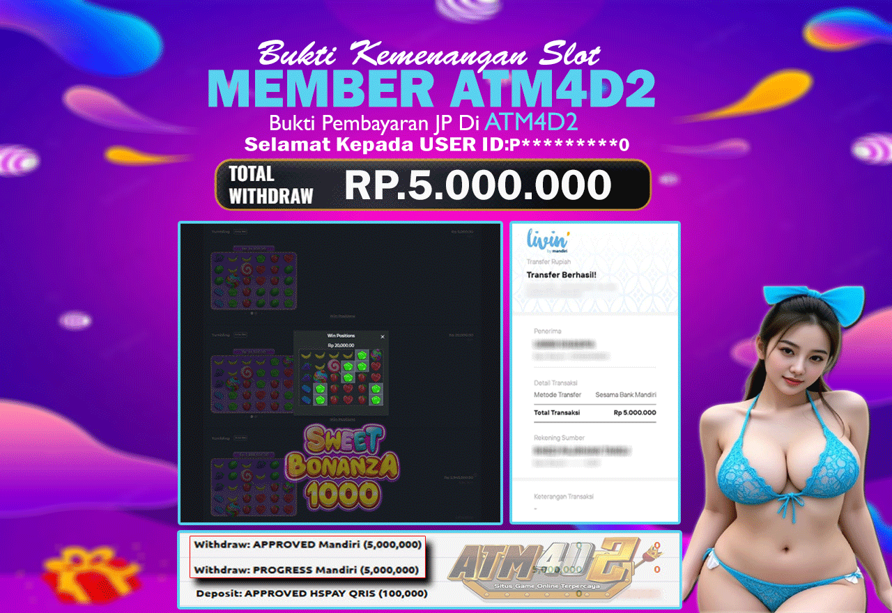 ATM4D2 dikenal sebagai situs terpercaya yang selalu menghadirkan pengalaman bermain slot online yang aman, fair, dan berlisensi resmi. Di sini, kami tidak hanya sekadar memberikan janji, tapi bukti nyata berupa slip kemenangan yang dapat Anda lihat secara langsung.