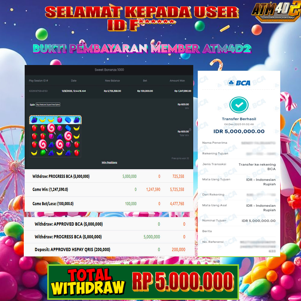 ATM4D2 dikenal sebagai situs terpercaya yang selalu menghadirkan pengalaman bermain slot online yang aman, fair, dan berlisensi resmi. Di sini, kami tidak hanya sekadar memberikan janji, tapi bukti nyata berupa slip kemenangan yang dapat Anda lihat secara langsung.